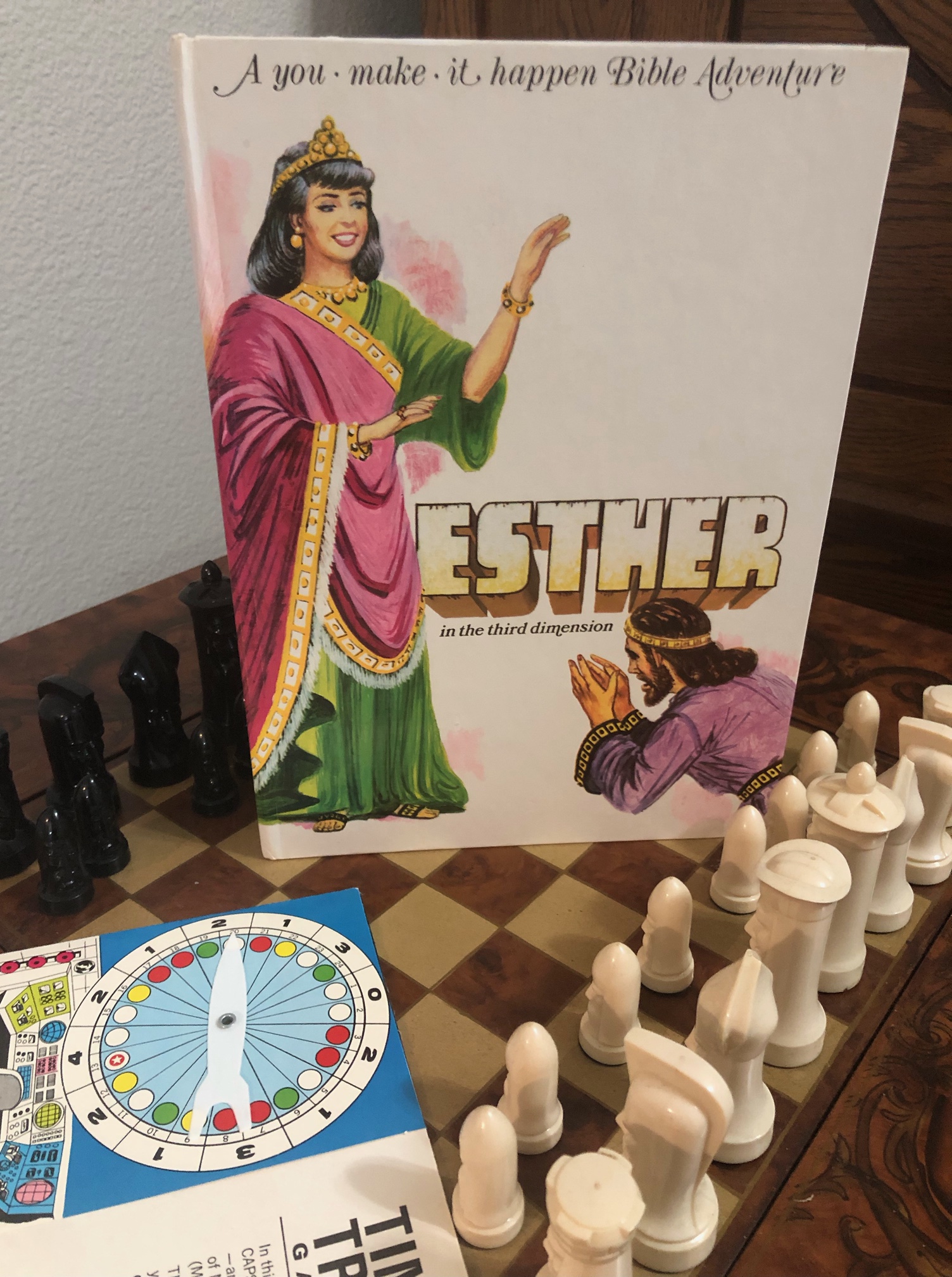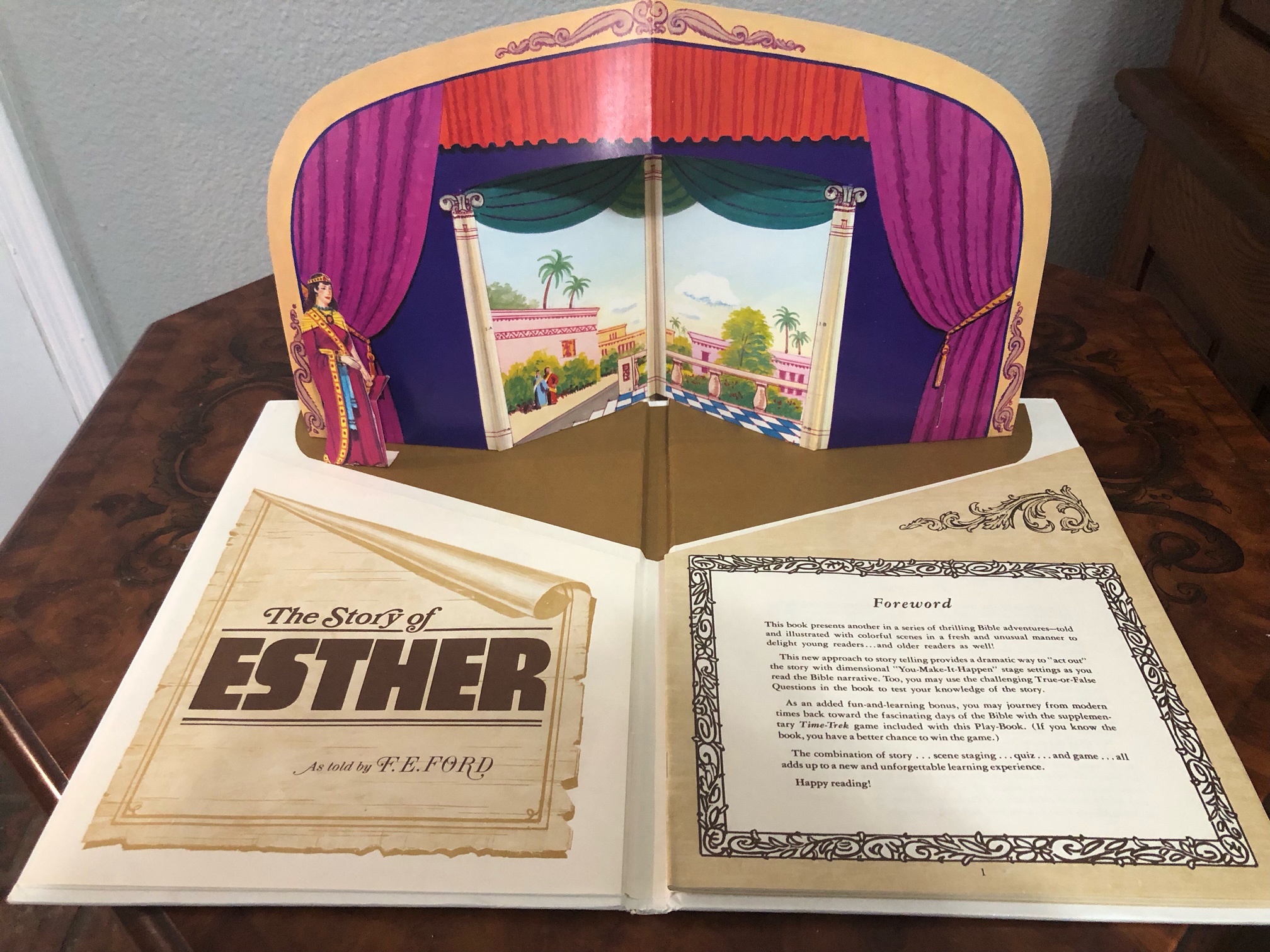 I was looking for bible-related gamebooks out of curiosity, and instead discovered this here “You Make It Happen” series of pop-up bible stories produced by Word Books Incorporated. There are at least six of them, retelling famous bible stories with pop-up dioramas. Information on these books is apparently nonexistent, and it’s a shame because this book is a novelty. The cover image of Queen Esther doing the Thriller dance is worth the price of admission.