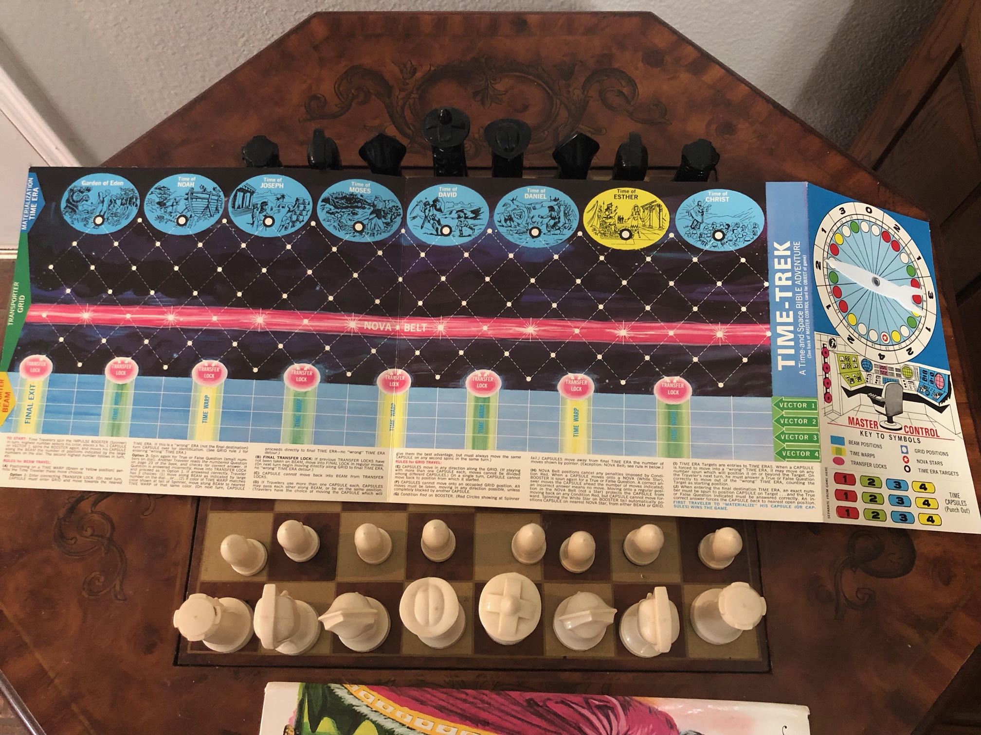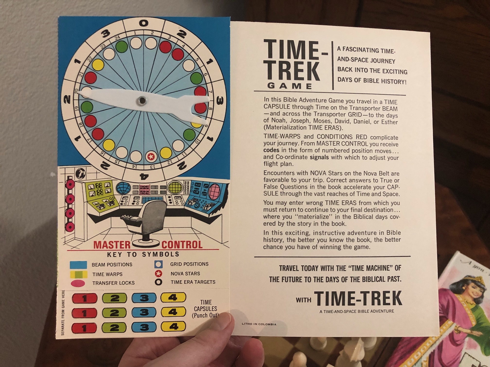 But if you thought a modular bible pop-up book was an oddity, you ain’t seen nothin’ yet! The premise of this series is that you, the reader, are a time-traveler sent back in time to study famous bible figures in person. So of course each book comes with a board game about travelling through time Bill and Ted style, phone booth time capsule and all!