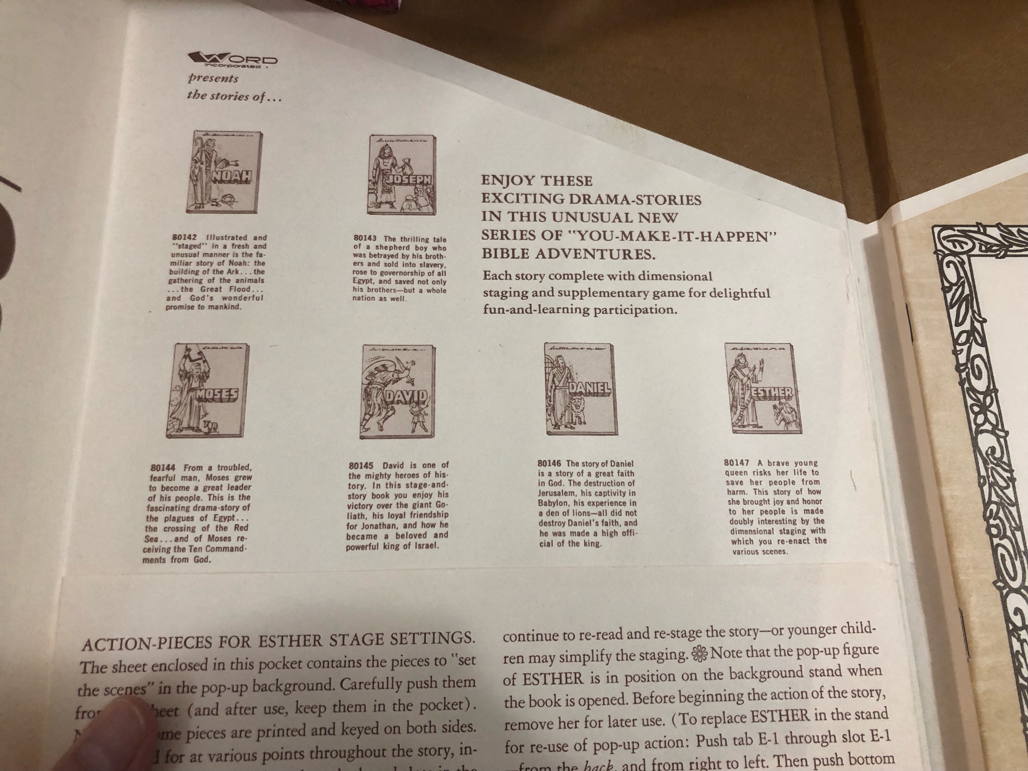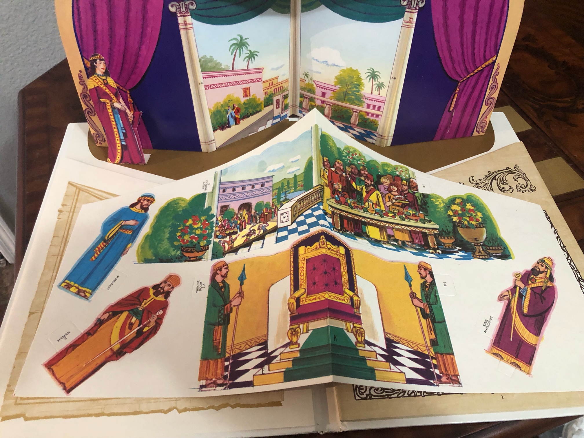 This is indeed a pop-up book, and as you read along with the story of Esther, you modify the diorama with a handful of characters and setpieces. The actual storybook is on the right, while on the left is a pocket for storing all the little paper diorama pieces.