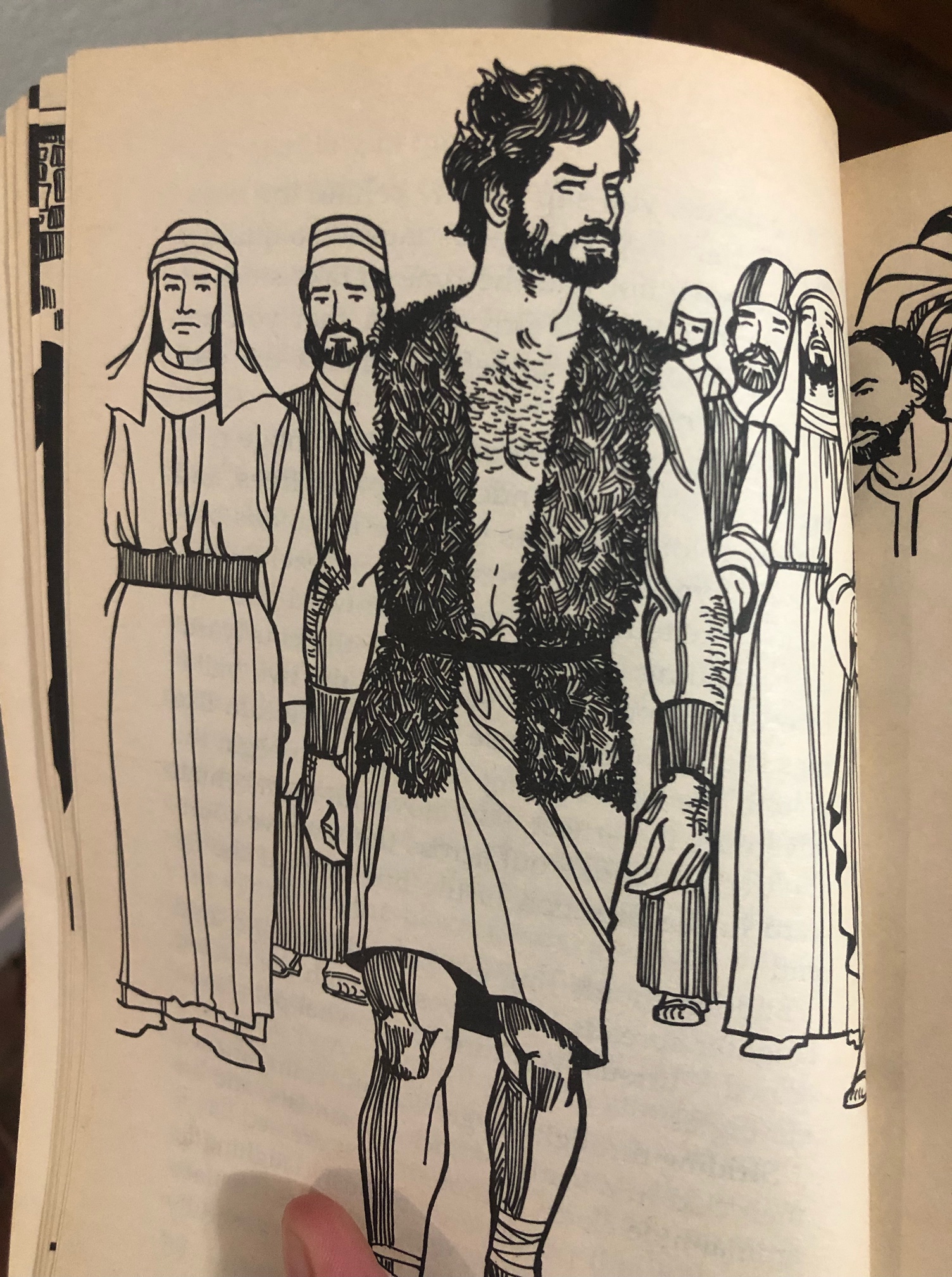I wasn’t as familiar with the story of Elijah, so I was pretty intrigued reading through this one, and shocked at some of the nasty things I got to witness in a juvenile fiction book. The first stop at the temple of Baal is memorably frightening, with the throngs shrieking and flailing like lunatics and the priest frothing at the mouth as he cuts himself with a ritual dagger before preparing to gut an infant at the altar. By that point our nameless protagonist said, “NOPE!” and skedaddled, and I don’t blame him.
