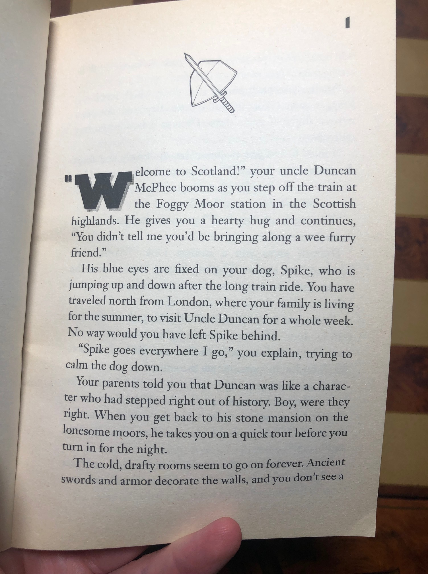You and your dog, Spike (even more creative names!) have just arrived at Uncle Duncan’s spooky old stone mansion in the Scottish moors, and the first thing he does is forbid you (and Spike) from exploring the upstairs room. So naturally, the moment Unca-Dunc steps out, you immediately head for that room and get sucked into a magic time-travel tapestry, which–and I wish I was kidding–turns out to be part of some kind of sweepstakes for time-travel wizards, with a chest fulla loot as First Prize, and death for everyone else. The treasure map even comes with a disclaimer about the hazards, and the fact that you can’t return to your own time until you die or find the treasure. Naturally you don’t read this part until AFTER you’re trapped in medieval Scotland.