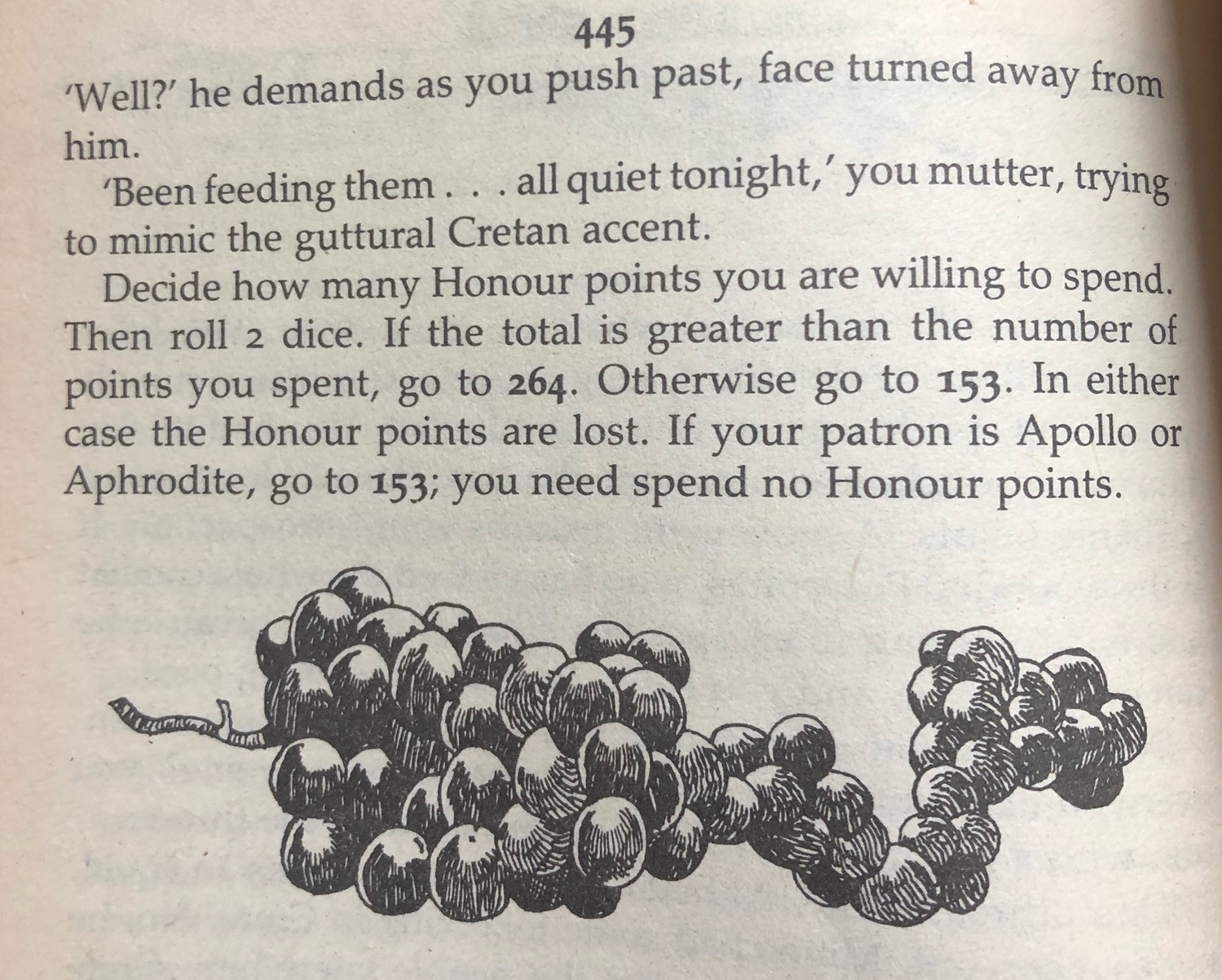This is interesting because whichever patron god or goddess you choose in this early stage gives you a different recap of the first book based on that deity’s influence in your adventure. In some, you spared the Amazon queen and got the name of a useful contact in Crete, while in others you happily slew her and her entire city.