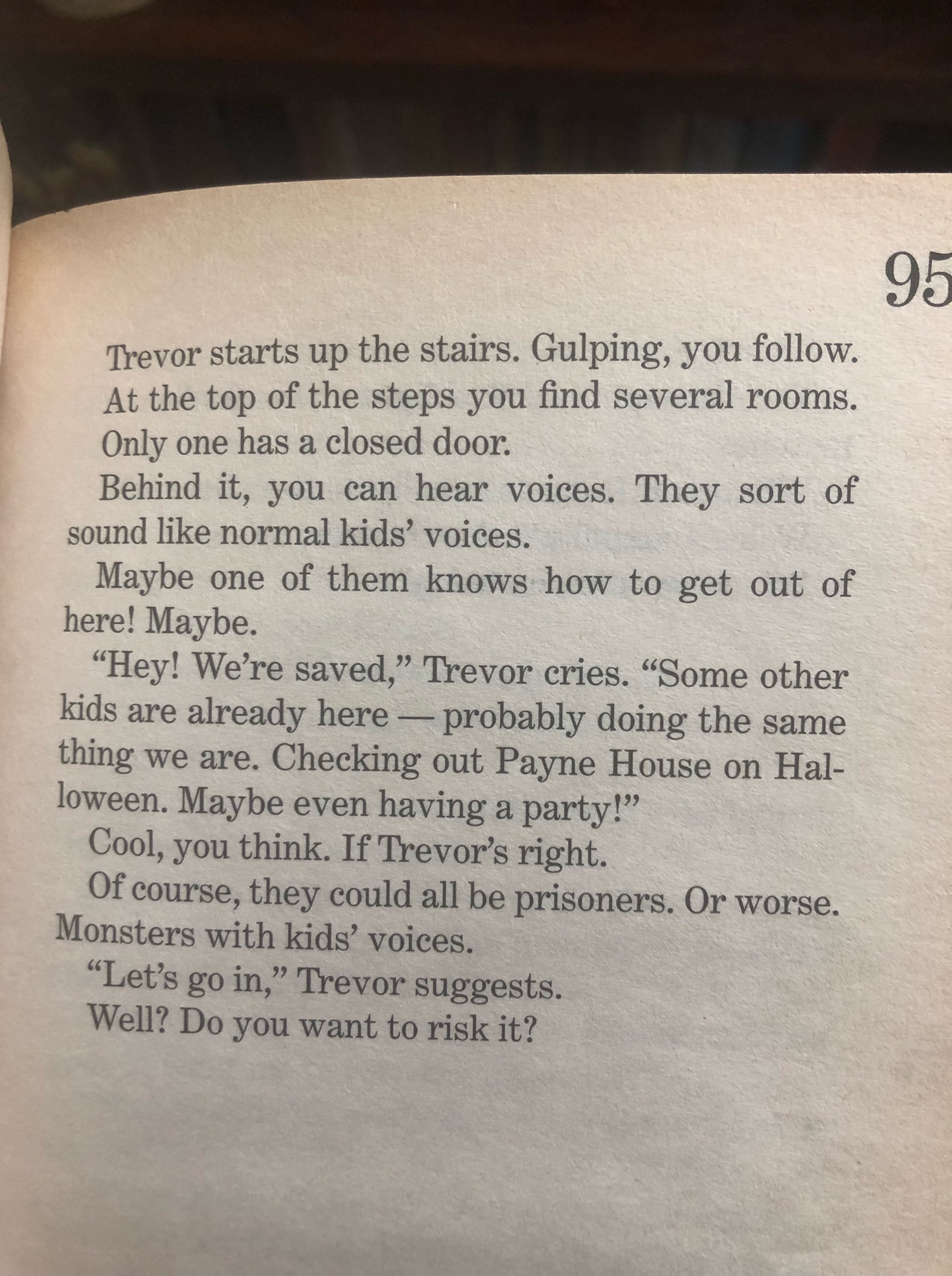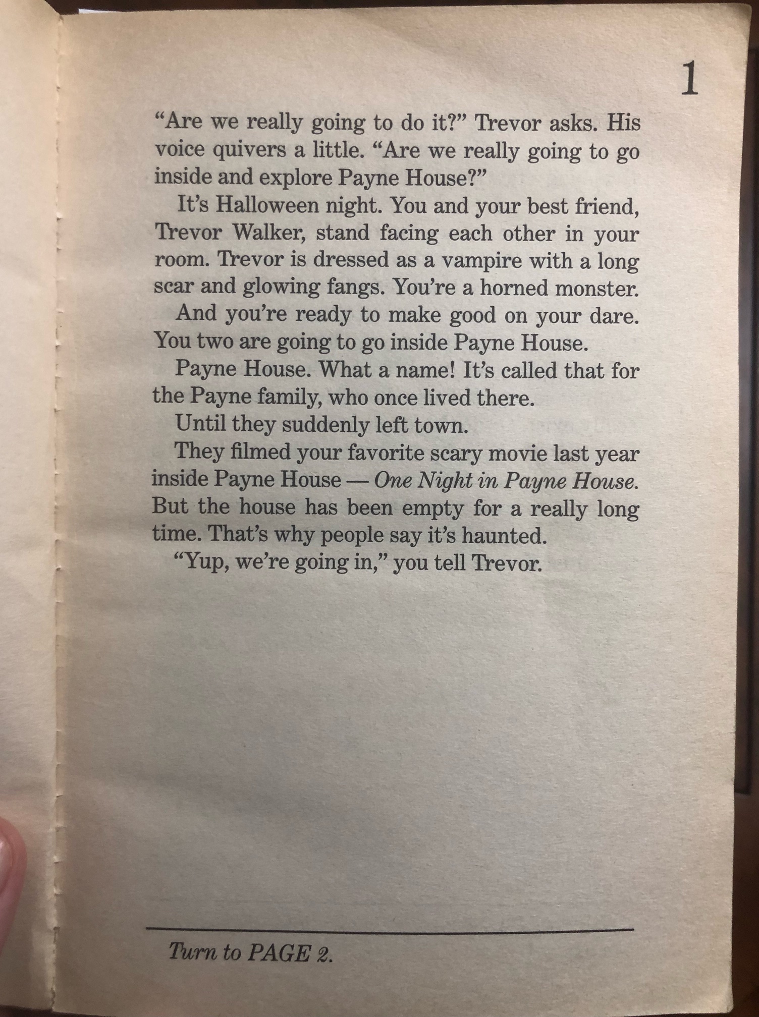 The big difference isn’t the age group or reading level, but the writing philosophy. Stine simply doesn’t want to scare his readers. In One Night in Payne House he has several situations that are objectively terrifying. I hear kids laughing and playing in a room, decide to go in and see what’s up, and find a room full of giggling children…with no heads. Or I’m exploring a dark, haunted house with my best pal at my side, turn back after a long silence, and find he’s gone. Just vanished with neither a trace nor a sound, and now I’m alone in the house with no way out.