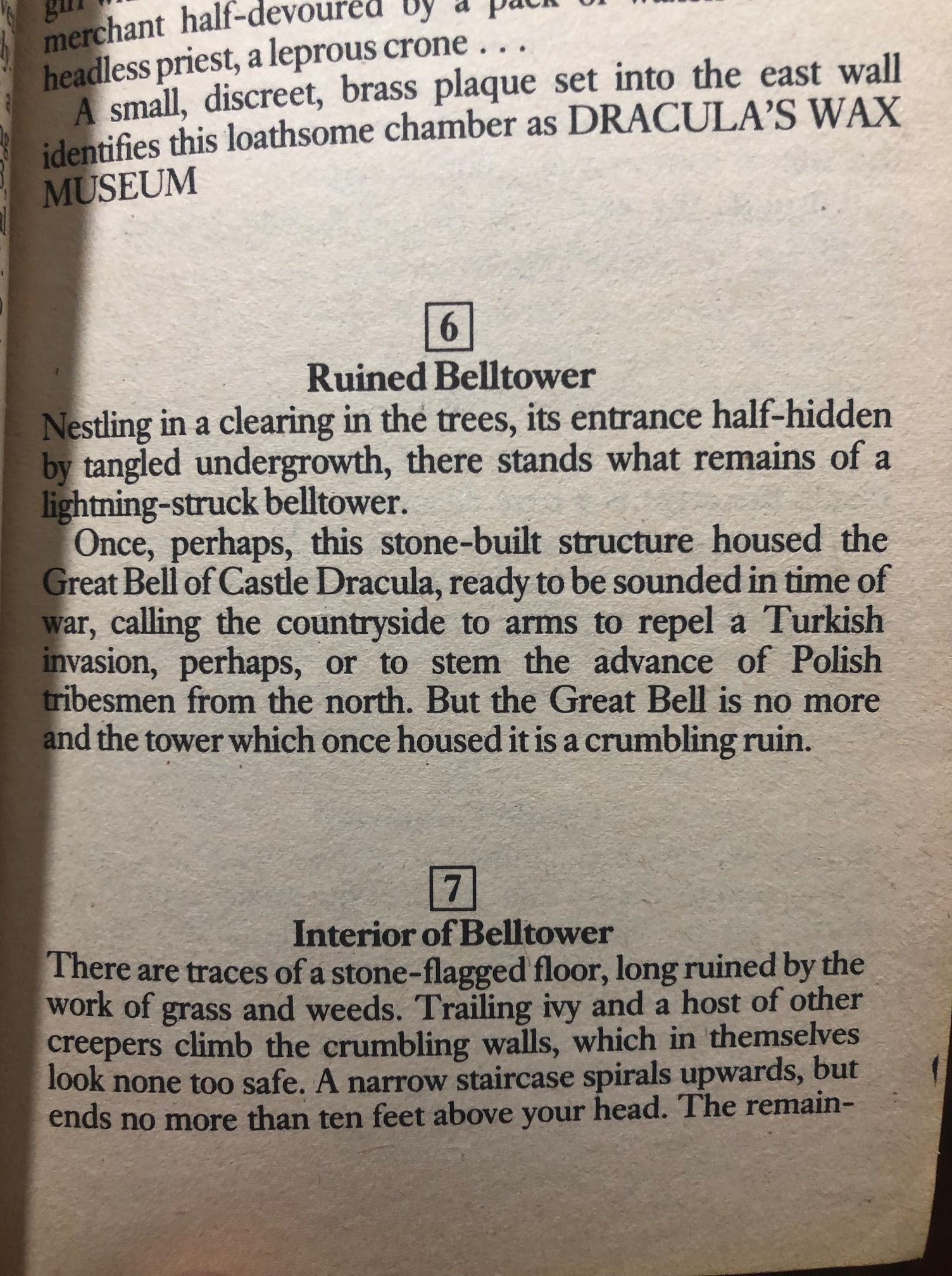 The moment I began Harker’s narrative and discovered that he was carrying a copy of GrailQuest, I knew I was in trouble. It’s not long before all the spooky, immersive atmosphere of the prologue chapters comes unraveled like a discount Christmas sweater. Dracula’s Castle combines the worst elements of two gamebook worlds: Goosebumps’s habit of going for comedy so as not to scare the kids, despite advertising itself as a scary series; and Fighting Fantasy’s trend of navigating dozens of one-sentence paragraphs where nothing happens and you feel like you’re walking in circles, before being abruptly killed in an impossible fight.