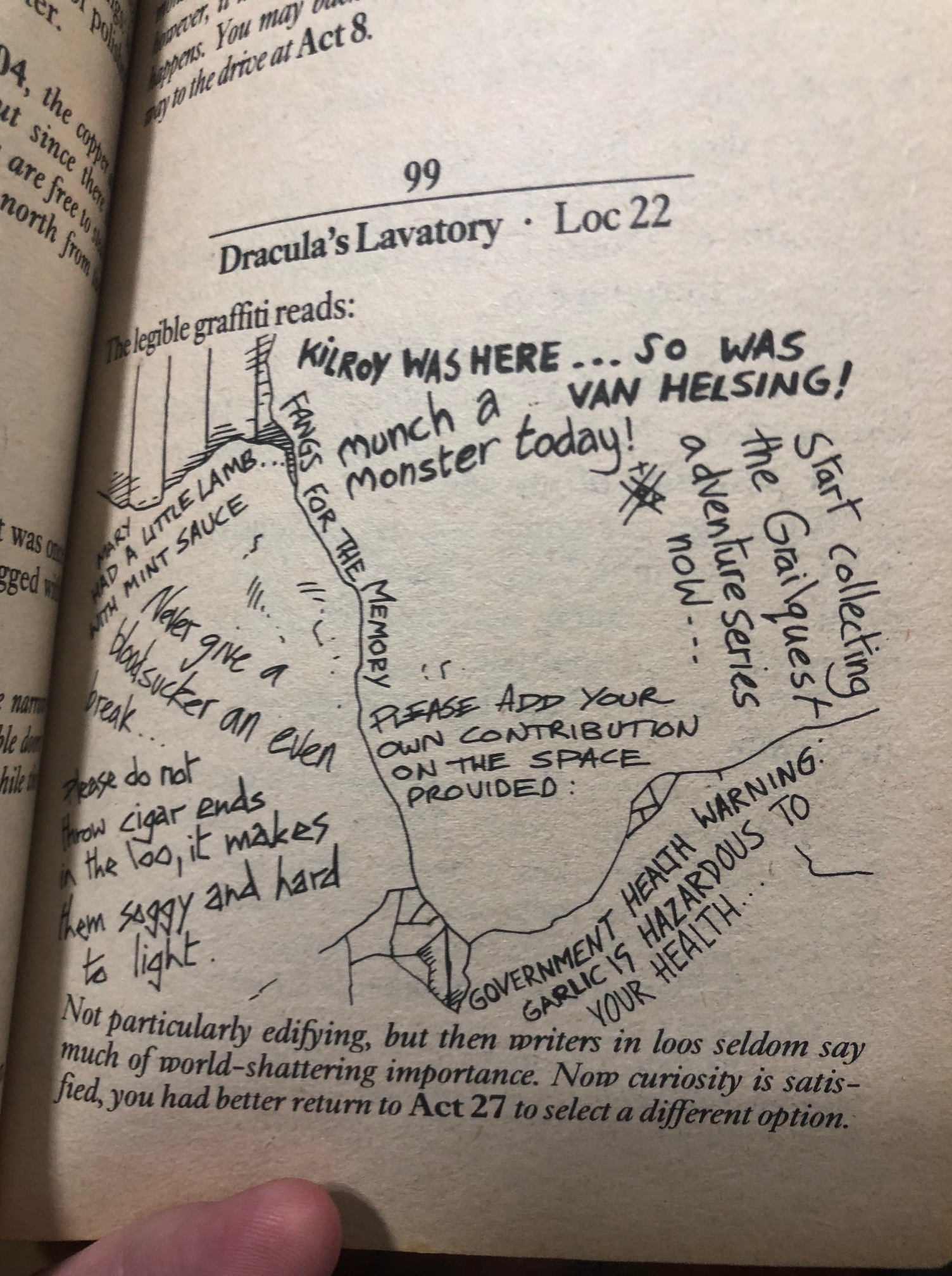 But when I discovered that Dracula’s bathroom was covered in silly public restroom graffiti (including ANOTHER GrailQuest advertisement), I got tired of the whole thing and called it a day. If there’s one thing I can’t stand, it’s an author who holds contempt for his own audience.