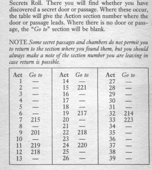 It should be noted that you have to keep track of a lot of things in this book, so you’ll want to utilize a few bookmarks to track your current Action section, current location, and the section you just vacated. Maybe one for the Secrets Section, too, since you have to remember to roll a 9-12 in order to search for shortcuts to other areas, and you won’t be prompted to search in the Action section.