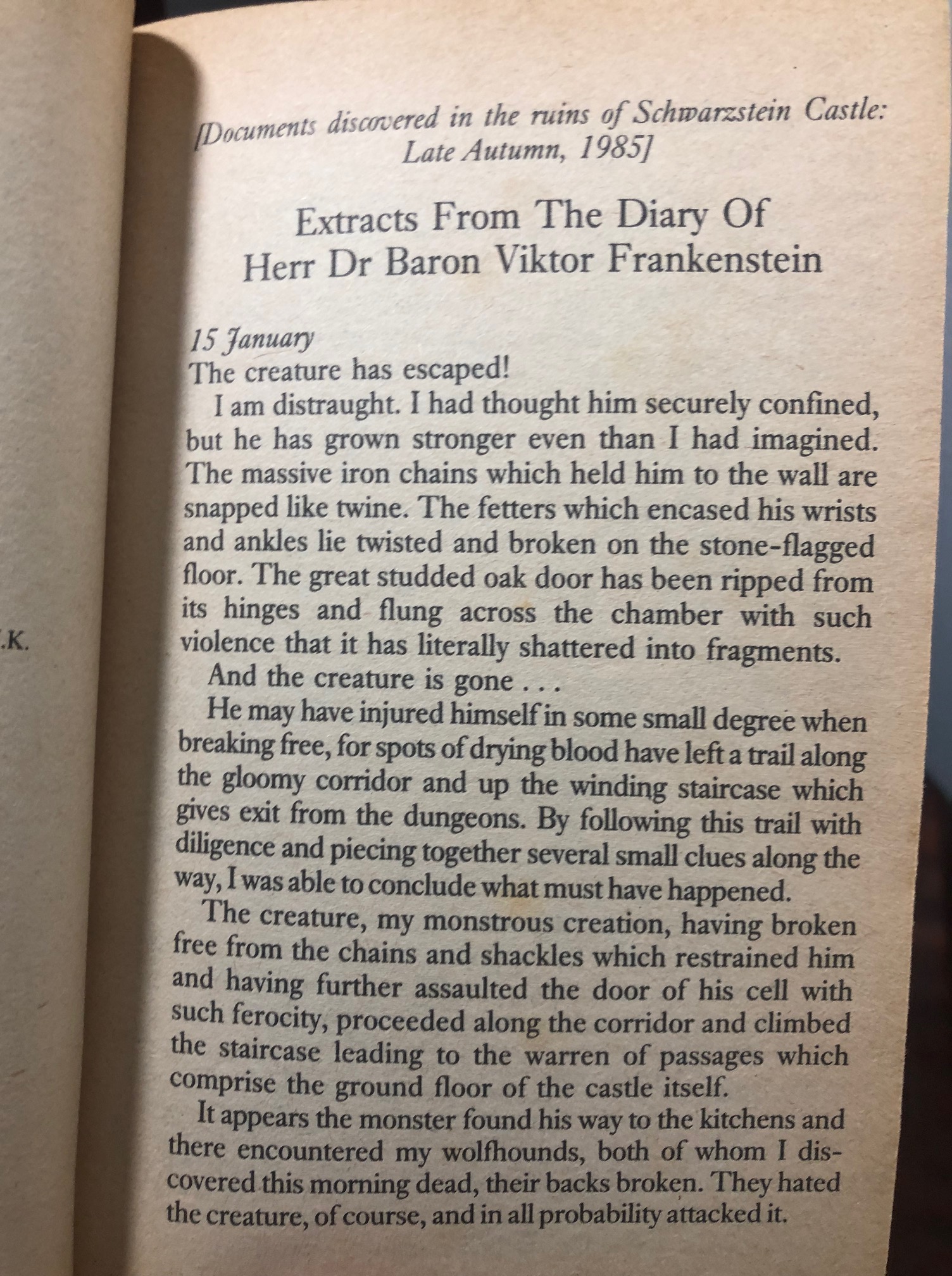 And not long after, we get phrases like “Papa Baron” in reference to Frankenstein, and references to the monster having a literal eagle eye, and the doctor wanting to kill the monster purely because it put him in the hospital accidentally after hugging him too hard. I don’t know if author Brennan was mandated not to make his scary book for kids, y’know, scary for kids, or if he genuinely thought his dumb little gags elevated his works. Or maybe he hated his work so much it was the only thing that kept him going, even though it’s at the expense of the work as a whole, as well as that of the reader.