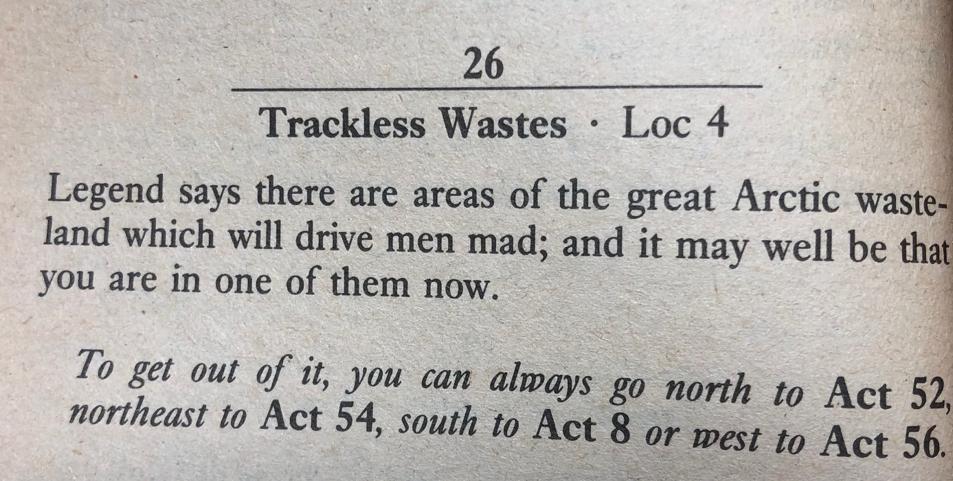 While playing the doctor—and I wish to God I was kidding—I found a genie in a lamp in a mountain. I woke it up, and then I had to fight it. Then when I barely defeated it, I had to fight it again before it would serve me, which made me very dead in-game, and very fed up out-of-game. That was pretty much the point where I called it quits altogether. Apparently half a dozen fantasy gamebooks all met up in the same frozen wasteland as Curse of Frankenstein, and they all just bled into one-another.