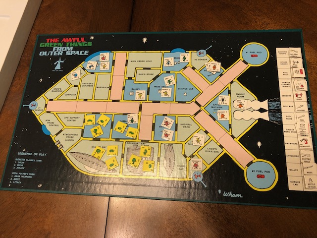 See, that nifty laser gun you just picked up might vaporize the monster…or it might make it grow. Or, even better, it may blow it to 1D6 pieces which can then grow into new monsters! So the crew spends most of the game trying to discover what each weapon does, in the hope of finding one that can actually be used to thin out the ever-growing horde, which is meanwhile dogpiling onto hapless crewman, eating them alive, and using their precious bodily fluids to produce even more monsters.