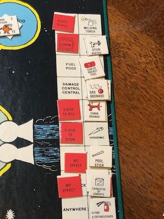 The highlight of this game (besides the monsters growing out of control and overrunning the ship in record time) is the weapon system. The crew can use all sorts of improvised weapons, collected from specific rooms around the ship. But the first time a crewman uses a weapon on a monster, it is permanently assigned a randomly drawn “weapon effect.”