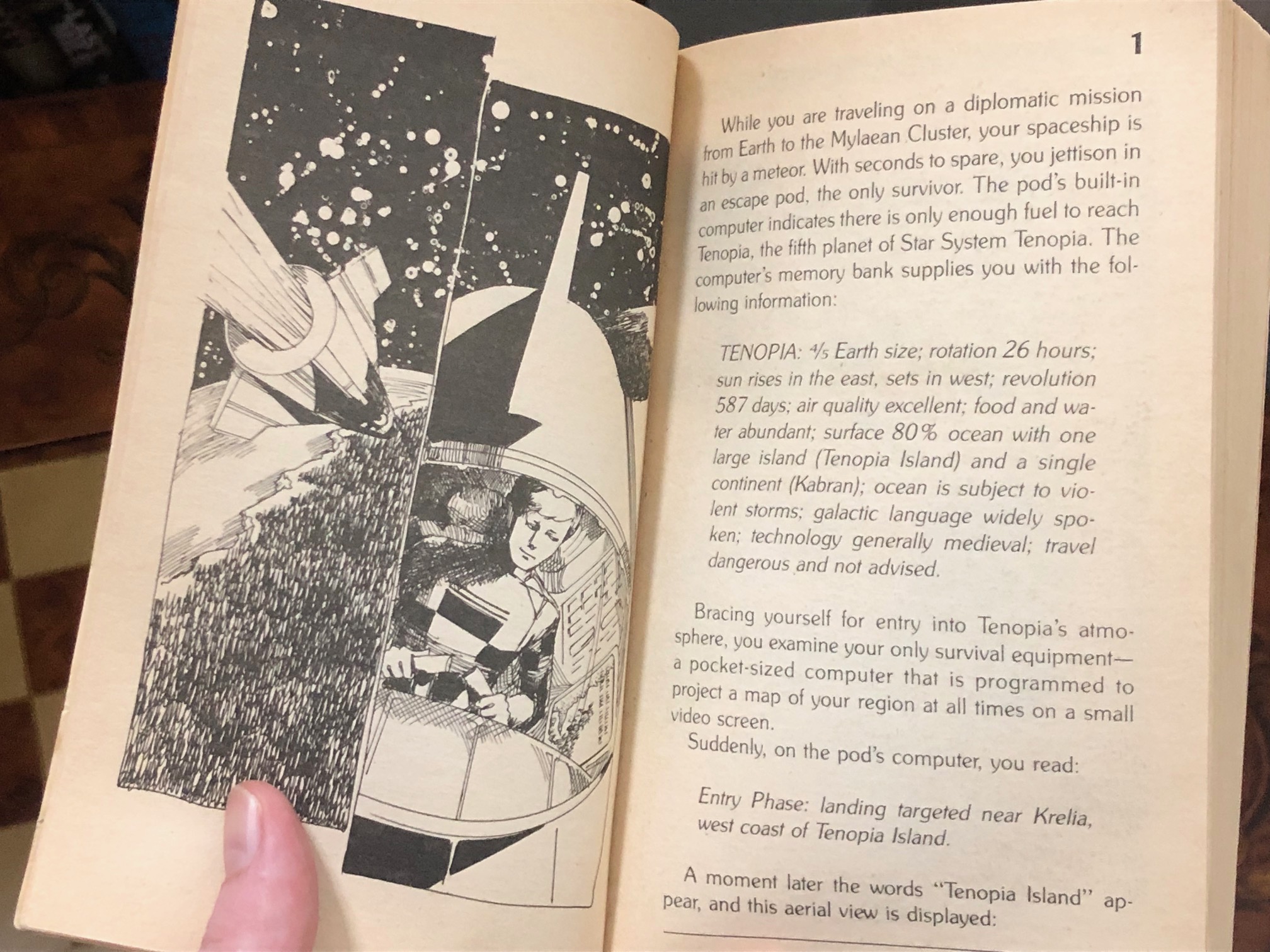 I was excited to start a new gamebook series I’d never heard of, especially one that involved exploring an alien planet a la Edgar Rice Burroughs… although, from the start I had the sneaking suspicion that I wouldn’t be romancing any bodacious otherworld princesses or primitive cavebabes on Tenopia. Ah, well.