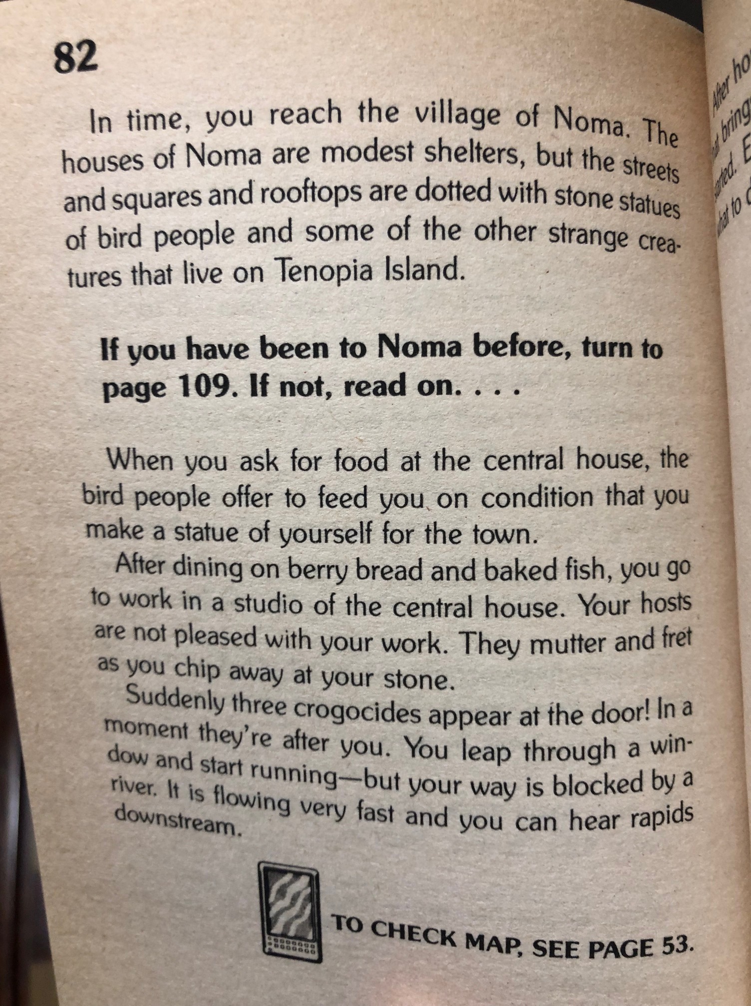 Basically, the whole book is a complex series of paths that loop back on one-another, so by the end of the adventure you feel like you’ve fully explored this alien continent. There is evidently no “game over” to speak of: you just take endless detours until you know every inch of the island and eventually find your destination, thus mounting your escape. Kind of a walking simulator in gamebook form.