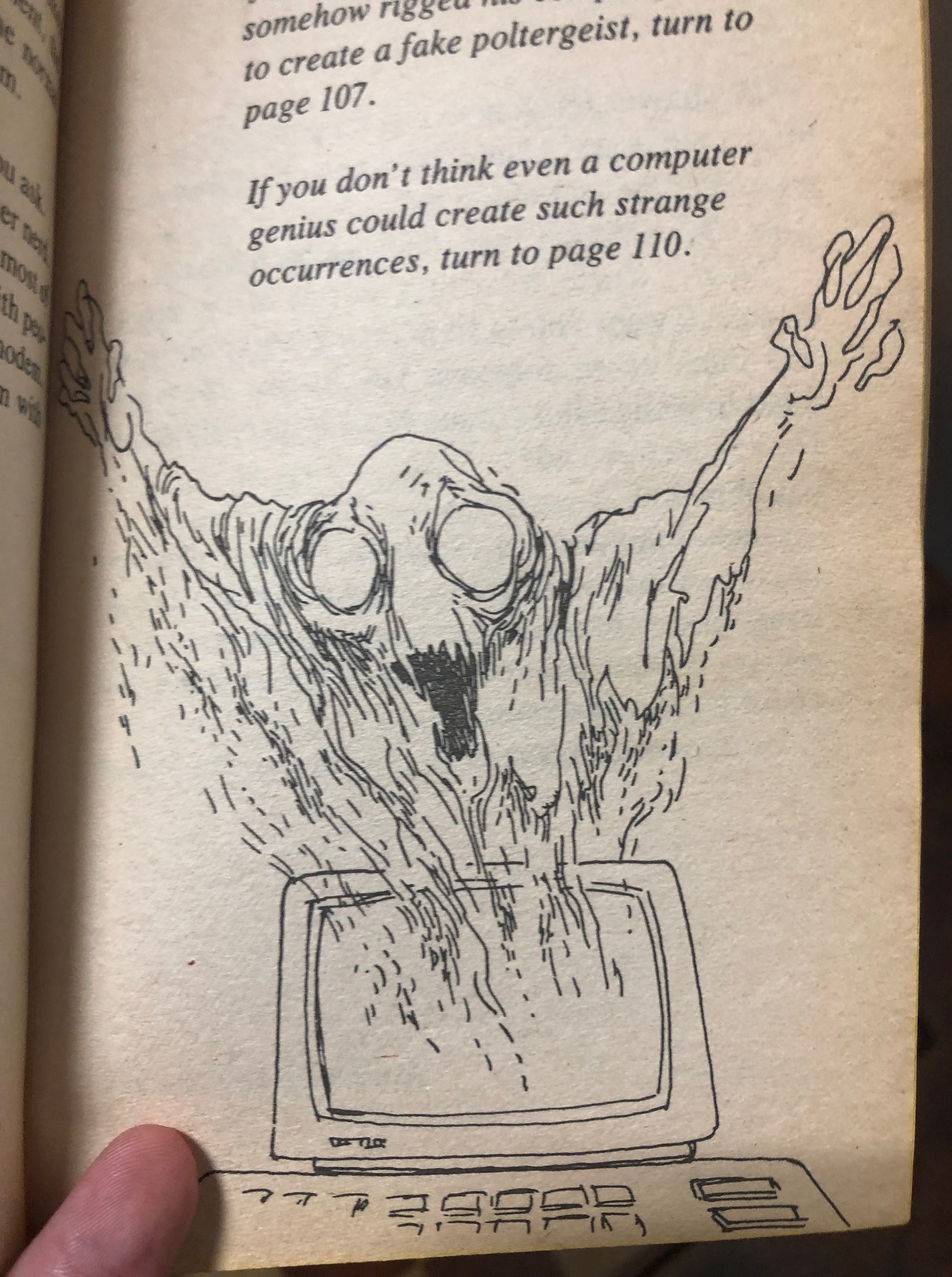 The highlight for me, without a doubt, was the “spend the night in the haunted suburban home” subplot. Each night the ghostly events become more intense, and I’m given the option of spending another night to hopefully crack the case, or saying “NO WAY” and letting the professionals take over. Like Icarus, I flew too close to the sun, and got the most chilling game over in the whole book.