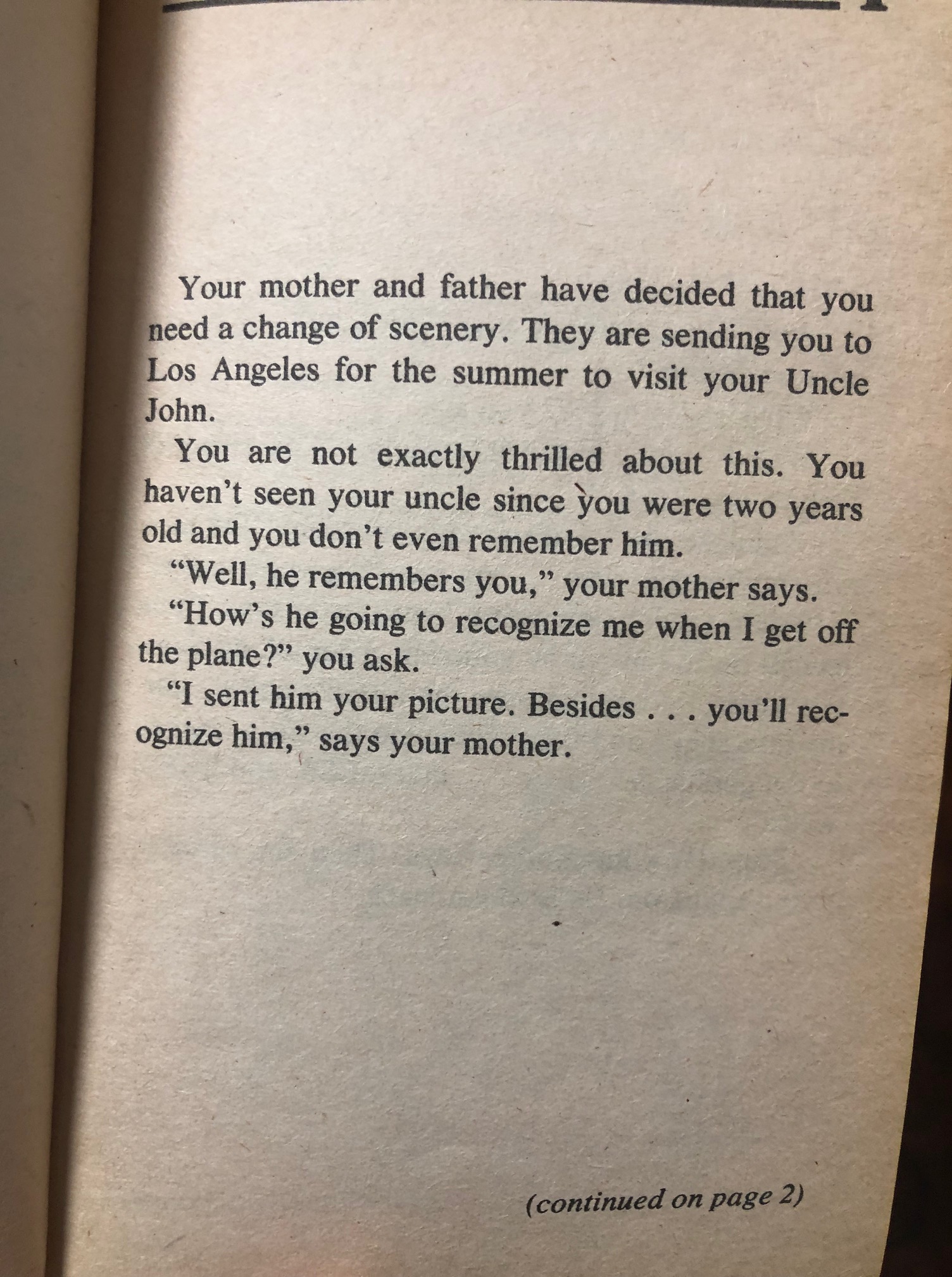 The narrative of Poltergeists, Ghosts, and Psychic Encounters (hereon referred to as PG&PE for the sake of my blood pressure–Which Way Books loved Mealoaf-length titles) really takes its time to set the stage: the first five or six pages are dedicated to our trip to LA and why we’re going, then meeting Uncle John and getting our Psychic Agent badge, before we are finally offered our first set of choices.