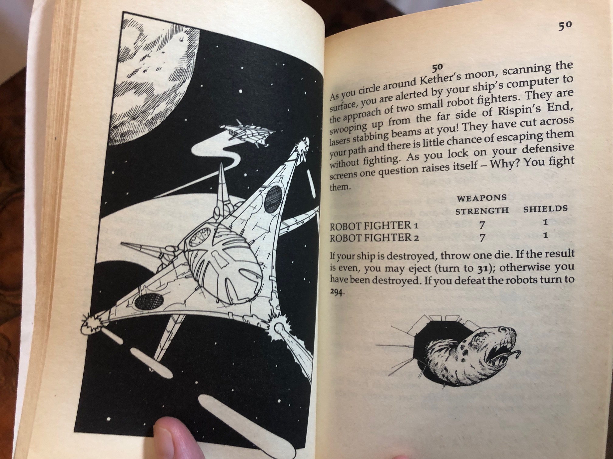 That’s all pretty bog-standard for Fighting Fantasy, but every volume in the series has a unique mechanic or three to set it apart from the others. In The Rings of Kether, we get “blaster combat,” pep pills, and a space ship with its very own set of stats!