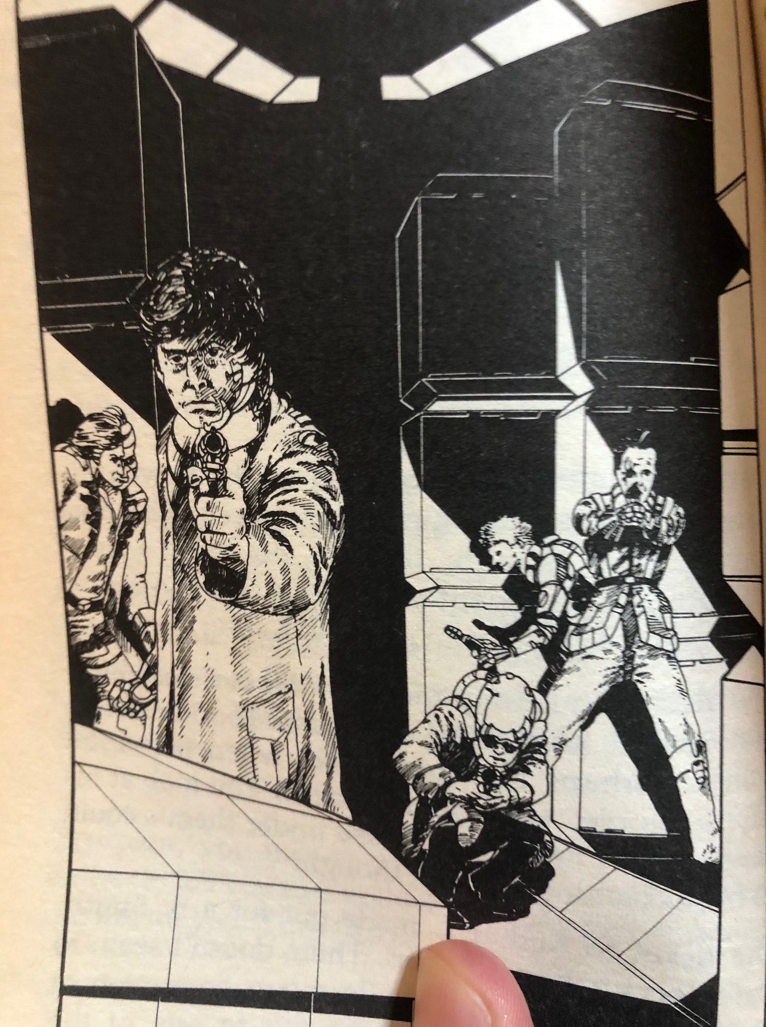 I should mention the illustrations by Nik Spender while I’m at it. They really capture the vibe of a neo noir story set in a broken down spaceport city: lots of gritty, grimy detail, expressive faces, and space tech straight out of an old DC Comics sci-fi anthology. The weirdo alien with the three eyes, arms, and legs is best in show without a doubt.