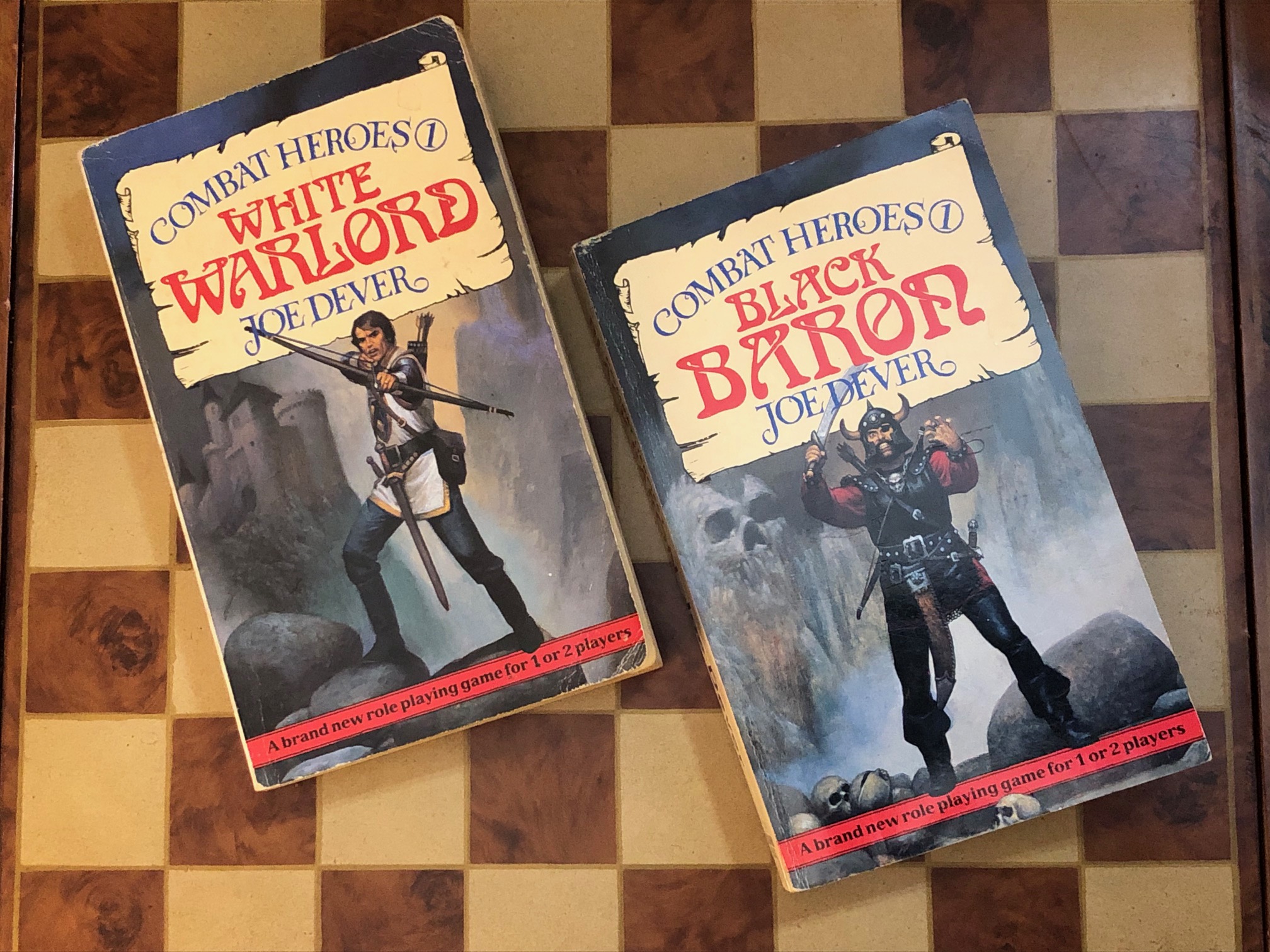 White Warlord and Black Baron are the first of two companion sets in the very short-lived Combat Heroes series by Joe Dever. They promise an unusual experience: not only are they designed to be played solo or with a friend, but they’re basically “first person shooter” gamebooks.