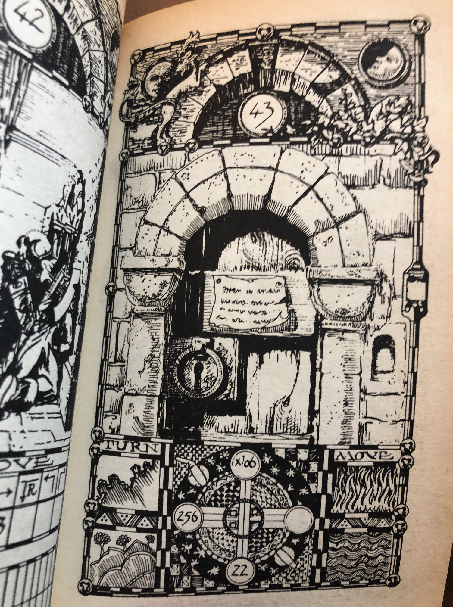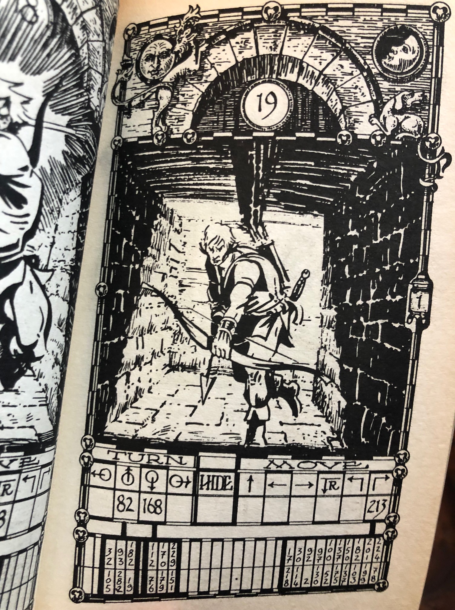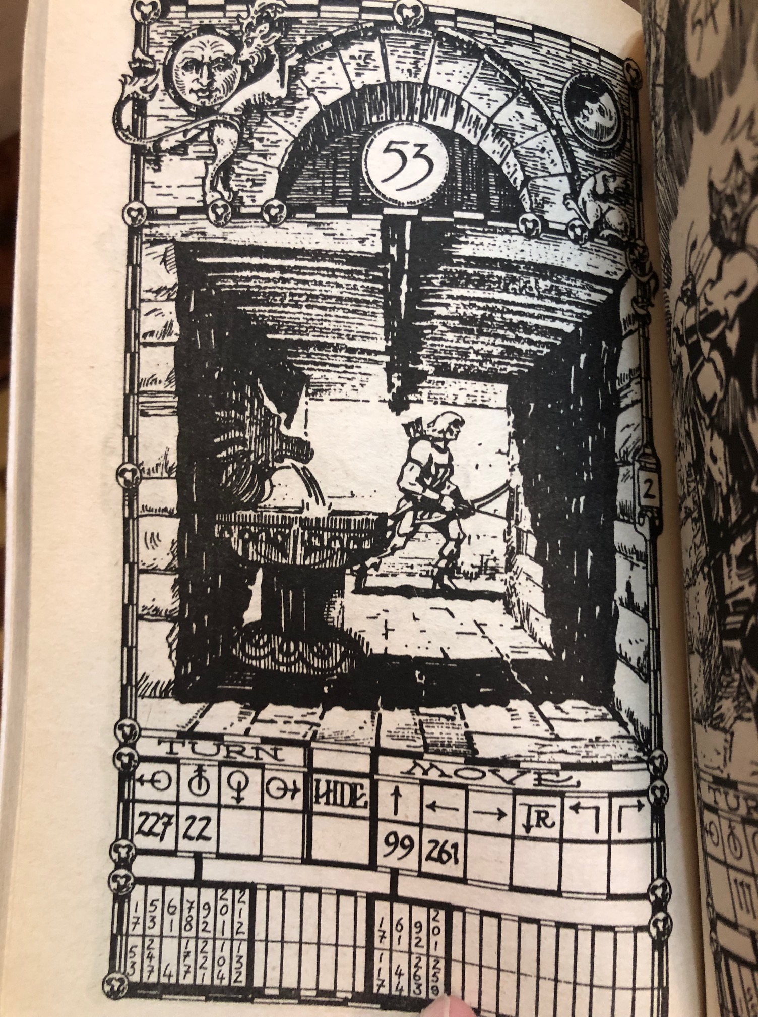 There’s more text to read in this play mode. Each page has a heads-up display at the bottom: a compass indicating which way you can go. If the number has an x in front of it, that means you turn to the events index in the back of the book and read that entry to see what happens. If it’s a trap, you lose endurance. If it’s a treasure object, you get your choice of which treasures to use to try and open it (and probably lose more endurance as you trial and error which item will open the stupid thing). The item listings on your character sheet are kept cleverly vague so you don’t know which treasure will go in which slot until you find them all. Lose all your endurance, and you die.